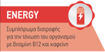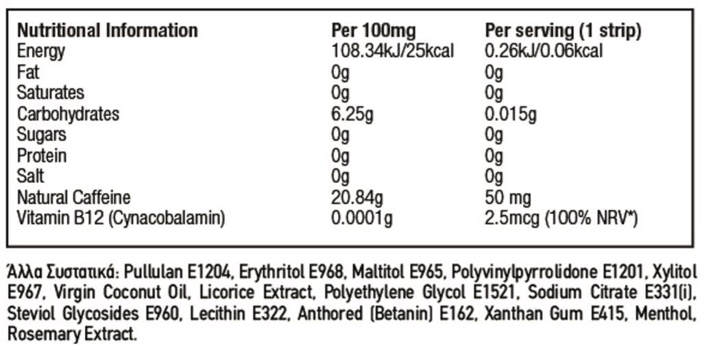 Το VITASTRIPS ENERGY παρέχει μια άμεση τόνωση χωρίς την παρενέργεια των σακχάρων που σχετίζεται με ενεργειακά ποτά. Περιέρχει τη βιταμίνη Β12, η οποία συμβάλλει στη φυσιολογική λειτουργία του νευρικού συστήματος και την μείωση της κούρασης και την καφεΐνη, η οποία έχει γνωστή δράση τόνωσης και ενεργοποίησης.