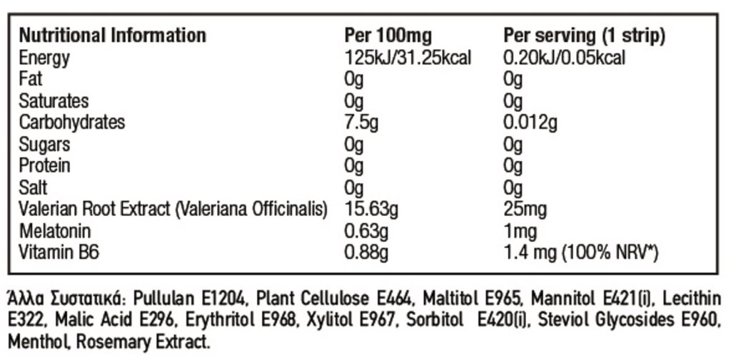 Το προϊόν VITASTRIPS SLEEP είναι ένα συμπλήρωμα διατροφής που περιέχει βιταμίνη Β6, μελατονίνη και βαλεριάνα. Σχεδιάστηκε για να βοηθήσει στην καταπολέμηση της αϋπνίας και την αποκατάσταση του κύκλου εγρήγορσης-ύπνου, χωρίς να είναι εθιστικό.